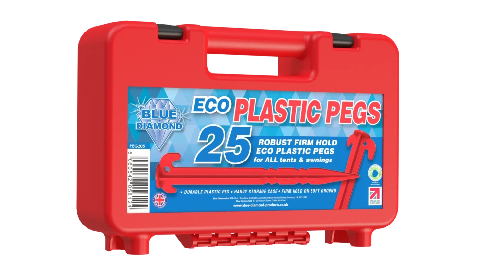 Made using recycled materials, the Blue Diamond Eco Plastic Peg is a heavy-duty plastic ground peg suited to hold firm in soft ground with the cross-section shaft profile. The handy plastic storage case contains 25 Pegs.