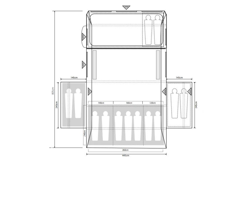 The expansive tinted windows permit a panoramic vista of the outside world and safeguard against harmful rays, whilst increasing privacy and illuminating the internal space on a morning; these are accompanied by zip-up curtains, which can be rolled totally back, or zipped fully in for complete privacy on an evening. A PE groundsheet has been sewn-in to increase convenience when pitching, reduce water ingression and prevent bugs from accessing the living area. This family tent has a full internal zip-back divider door panel, which is partnered by a huge mesh panel, large windows, and privacy blinds, creating a welcoming front porch area for alfresco relaxation.