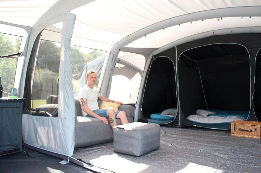 The all-new 9.0DSE model is based on the best selling Airedale 9.0DSE from the award-winning Airedale range, in luxury breathable polycotton with upgraded features such as inflatable double side annexes (registered design) and the acclaimed patio style double side doors & all-new front porch removable groundsheet system; this new polycotton model is set to elevate, stimulate and accentuate your luxury family camping holiday experience, providing maximum living and sleeping accommodation for even the largest family. Constructed from our trusted technical polycotton fabric for breathability, keeping down the internal temperature in warm weather whilst vastly reducing humidity & condensation plus cutting down external noise. With exceptional features such as roof light windows, extra deep darkened bedrooms & Outdoor Revolution’s famed air tube pressure relief valve system as standard, it’s clear to see the distinct technical advantages that breathable polycotton offers for camping in warmer climates.