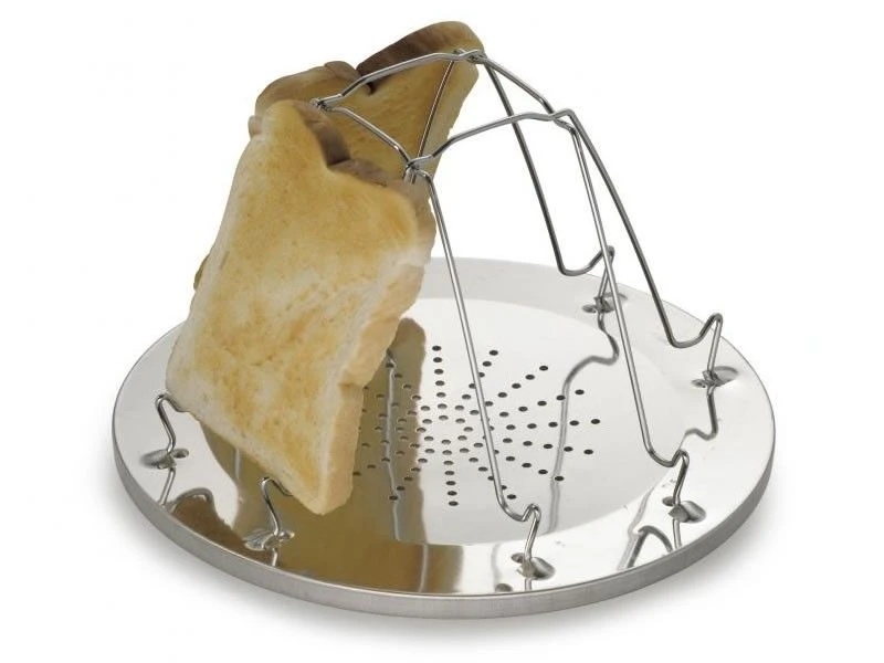 This 4 Slice Folding Toaster has a circular steel plate with four folding wire struts supporting grips that can hold up to four small bread slices.