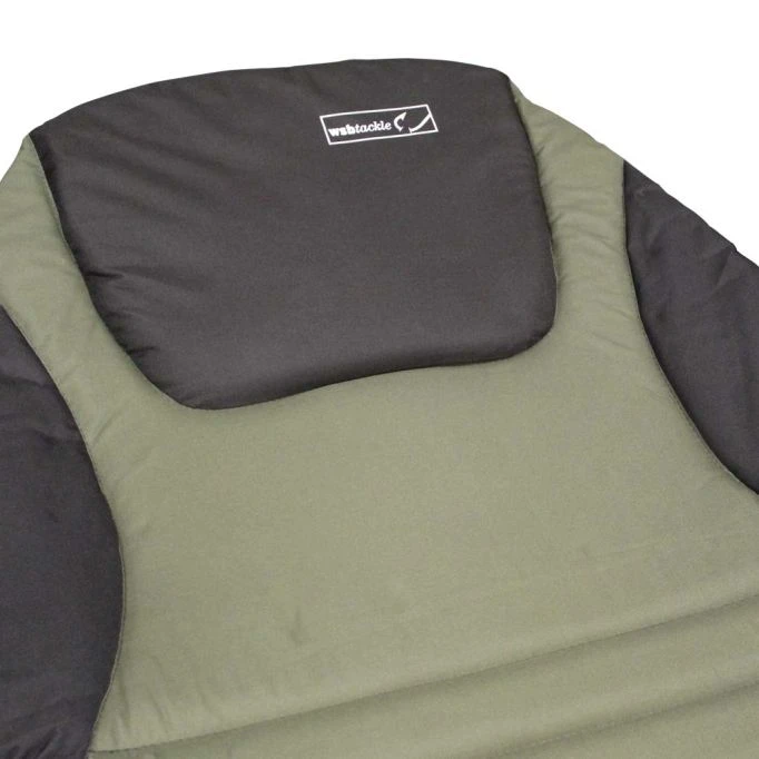An extremely comfortable and very stable WSB 6-leg bed chair in 2-tone Oxford material featuring an integral pillow, adjustable pivoting mud feet and a reclining system.