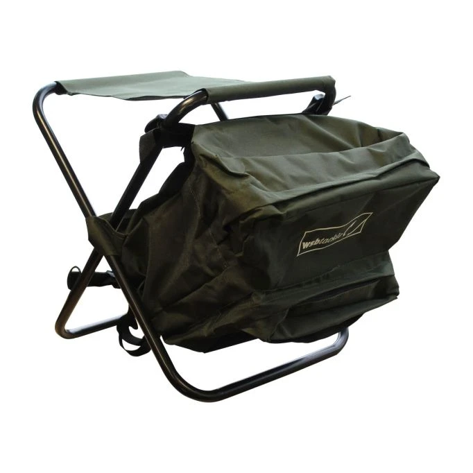 A Green nylon WSB rucksack stool with an outside front pocket, two shoulder straps and a waist strap.